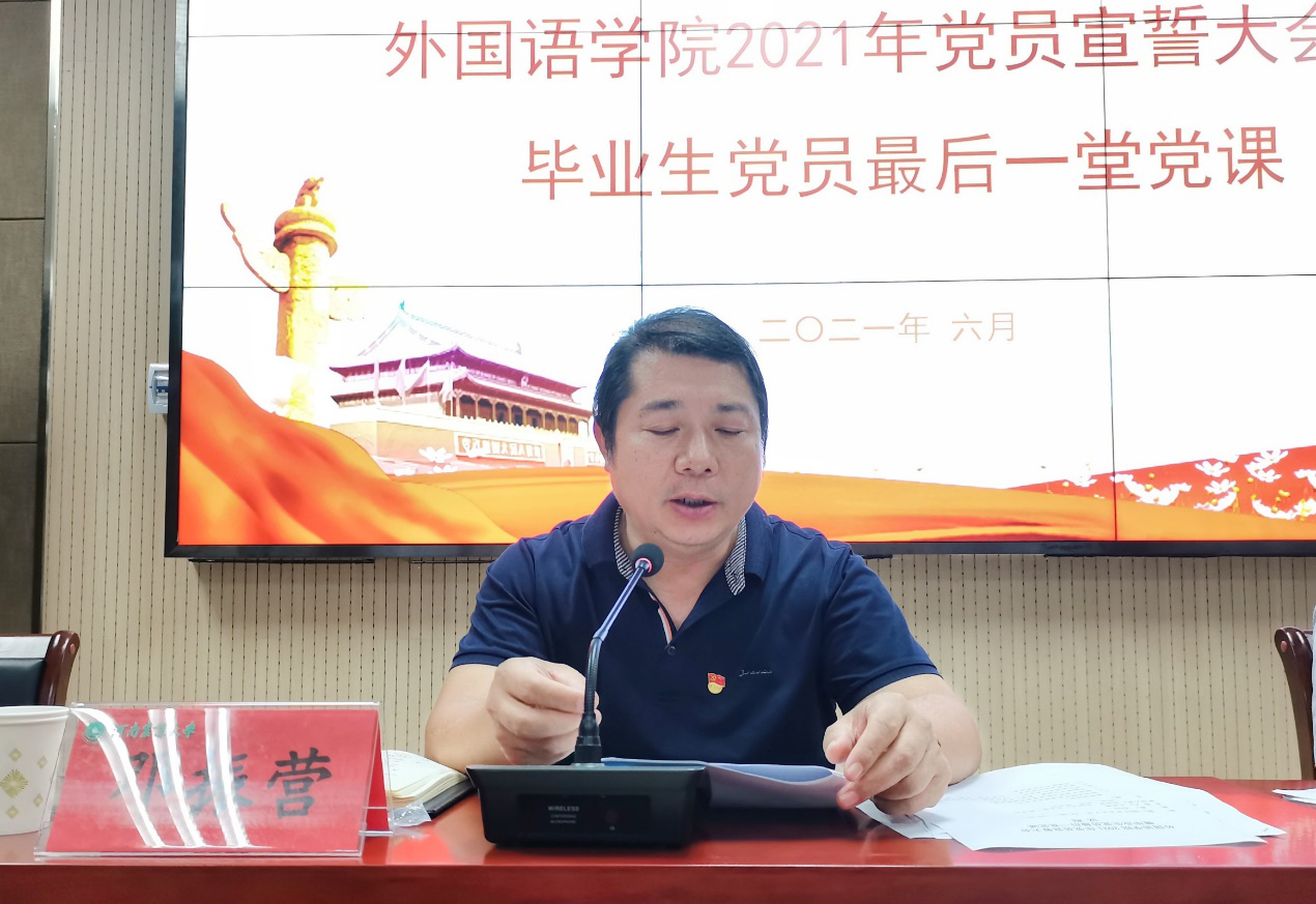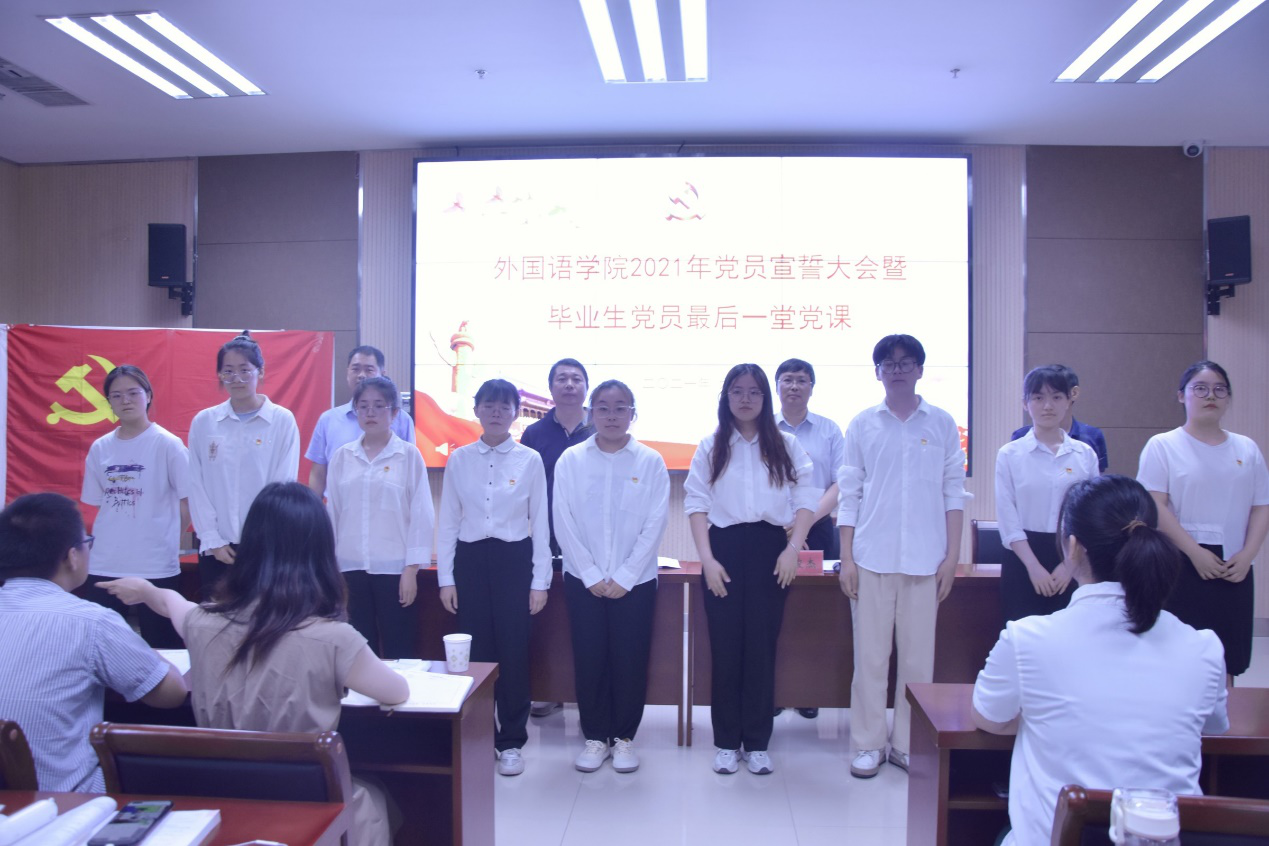 本网讯(审稿:王启佩 供稿:陈桃 黄湘)为热烈庆祝中国共产党一百周年华诞,进一步加强党员党性修养,外国语学院于6月7日晚举办了2021年党员宣誓大会暨毕业生党员离校前最后一堂党课。院领导班子成员,及全体学生党员参加会议。