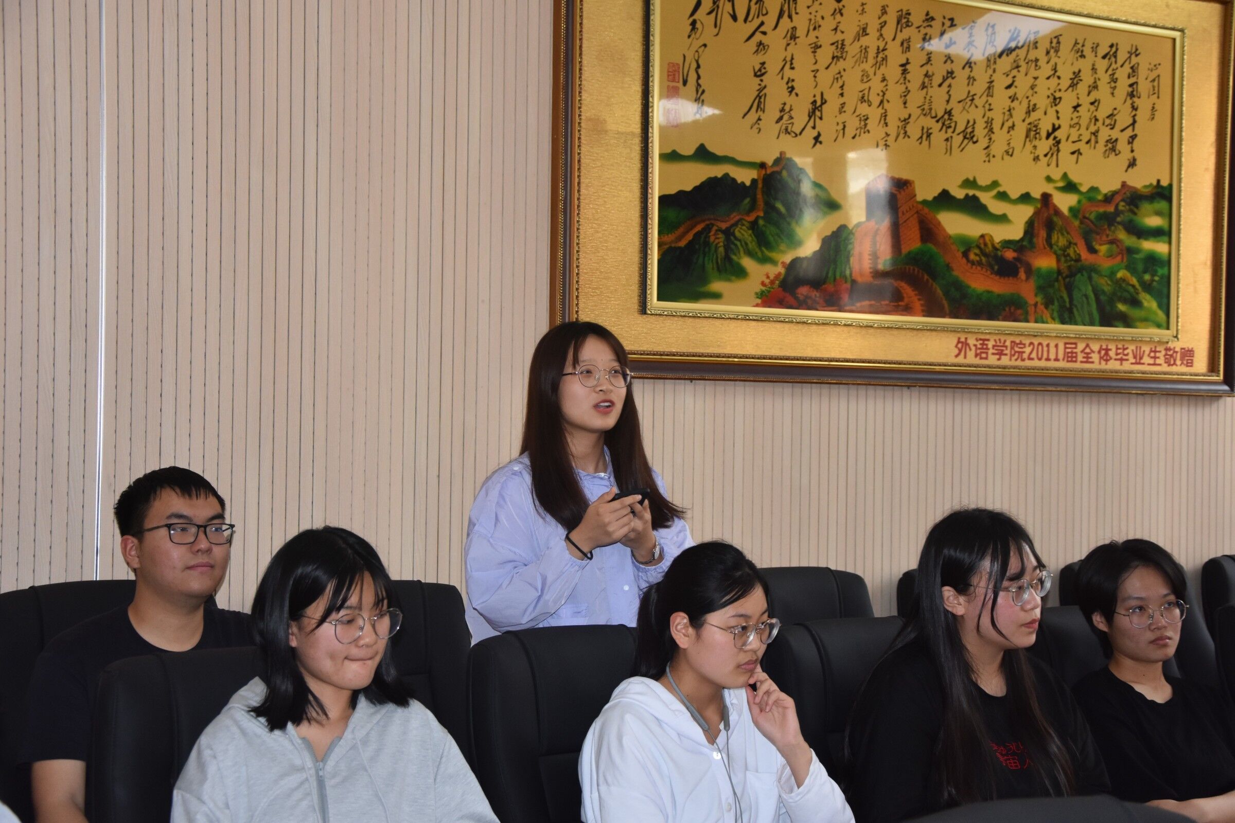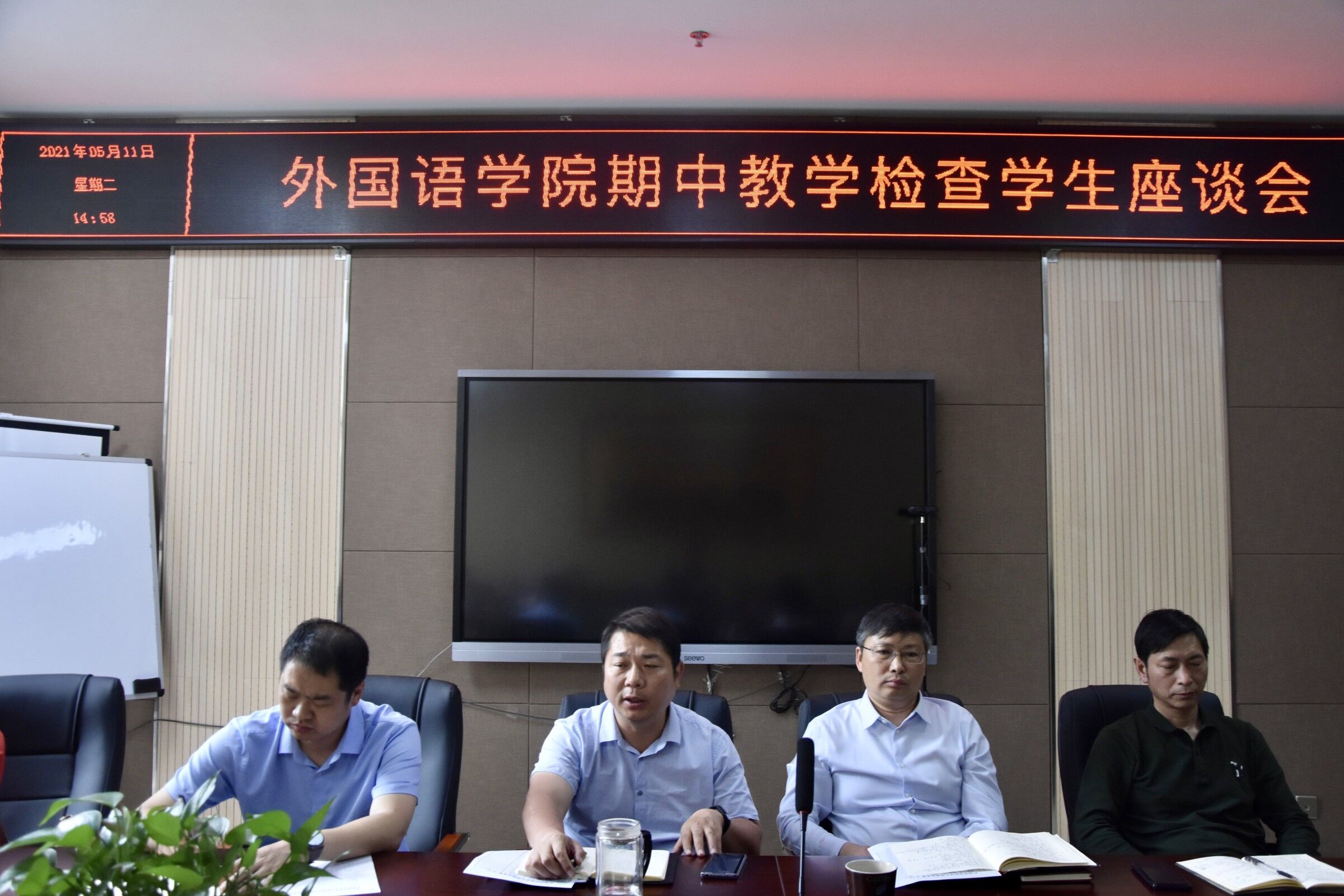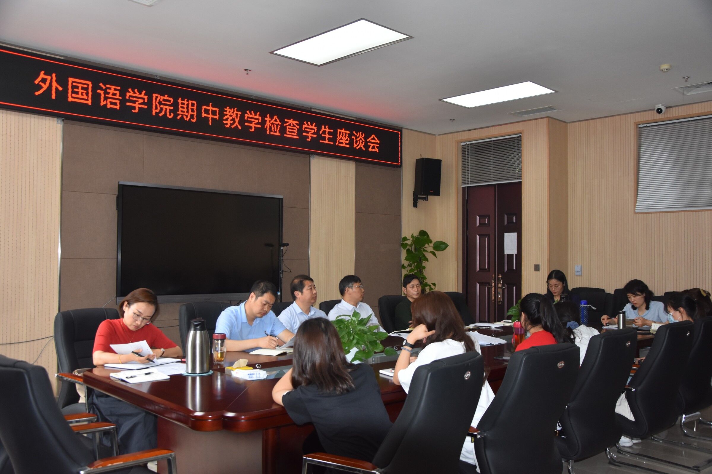 本网讯(审稿:陈桃 供稿:黄湘)为全面掌握和了解学院教学情况,改进教学方法,倾听学生心声,5月11日中午12点半,外国语学院于龙子湖校区繁塔楼A320会议室召开期中教学检查学生座谈会。院领导班子成员,各系部室主任以及各班学生代表,参加会议。会议由院党委书记邓振营主持。