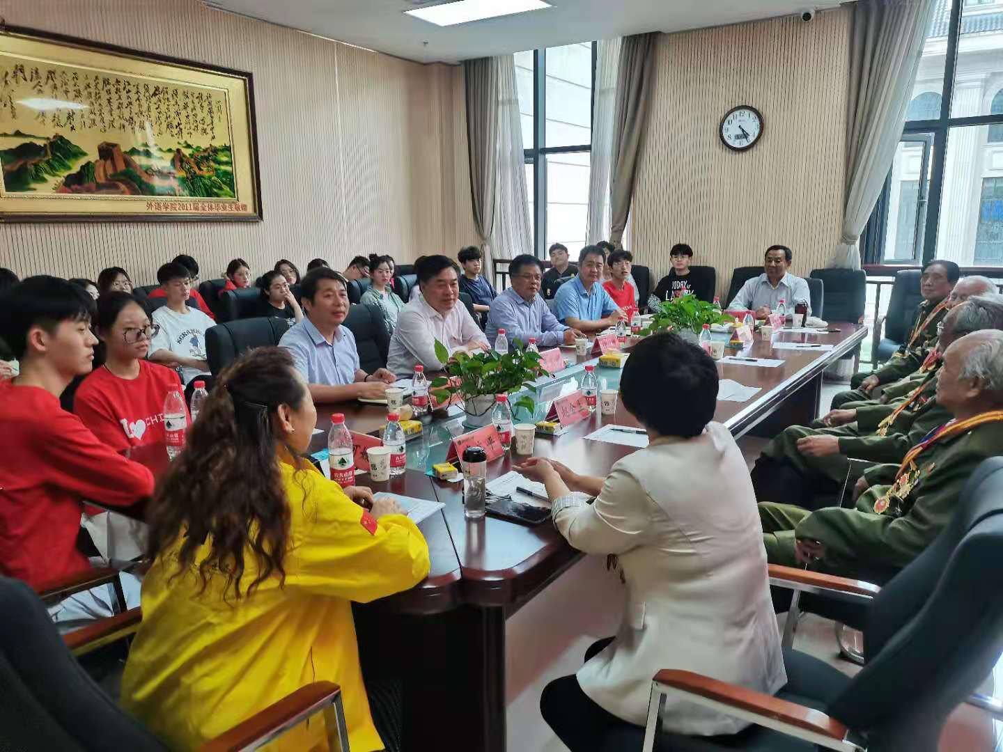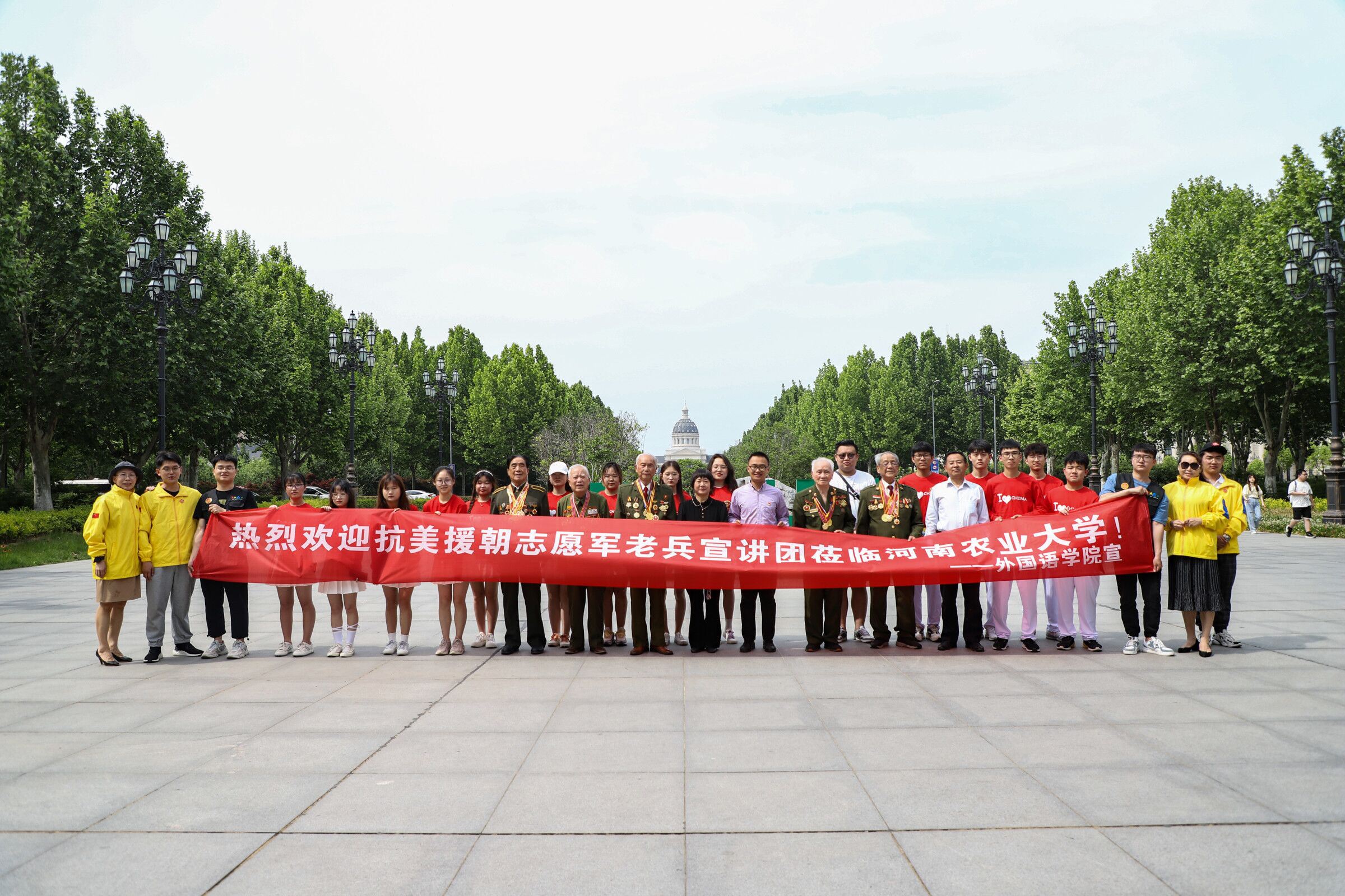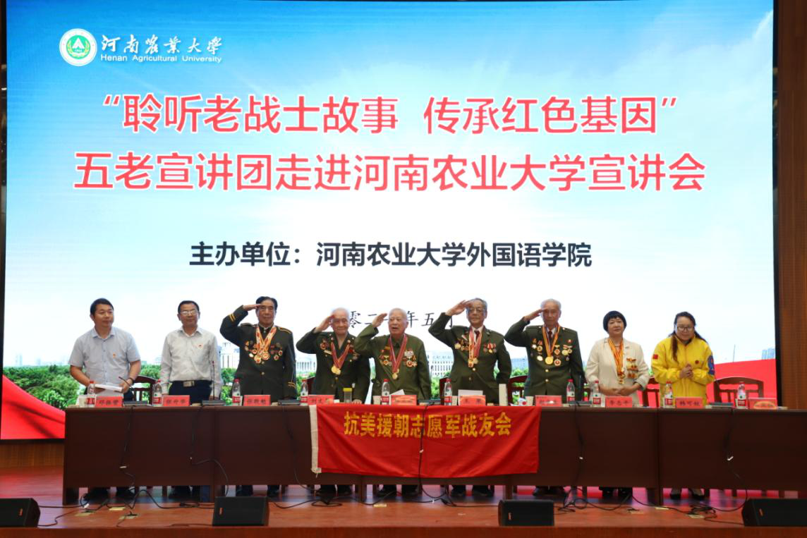 本网讯(审稿:王启佩 供稿:陈桃)为纪念建党100周年,传承抗美援朝精神,激励青年勇担历史重任,争做时代先锋,5月11日下午,抗美援朝志愿军战友会老战士杨立新、王果、刘文昌、赵金生和张敬魁以及全国劳动模范李志平、河南省道德模范张升华、“善行团”河南省会会长韩可姣等人走进河南农业大学外国语学院,为学院师生上了一场别开生面的党史学习教育课。校党委副书记、工会主席李成吾,学工部部长徐峰以及学院班子成员、师生代表等300余人参加,活动由院党委书记邓振营主持。