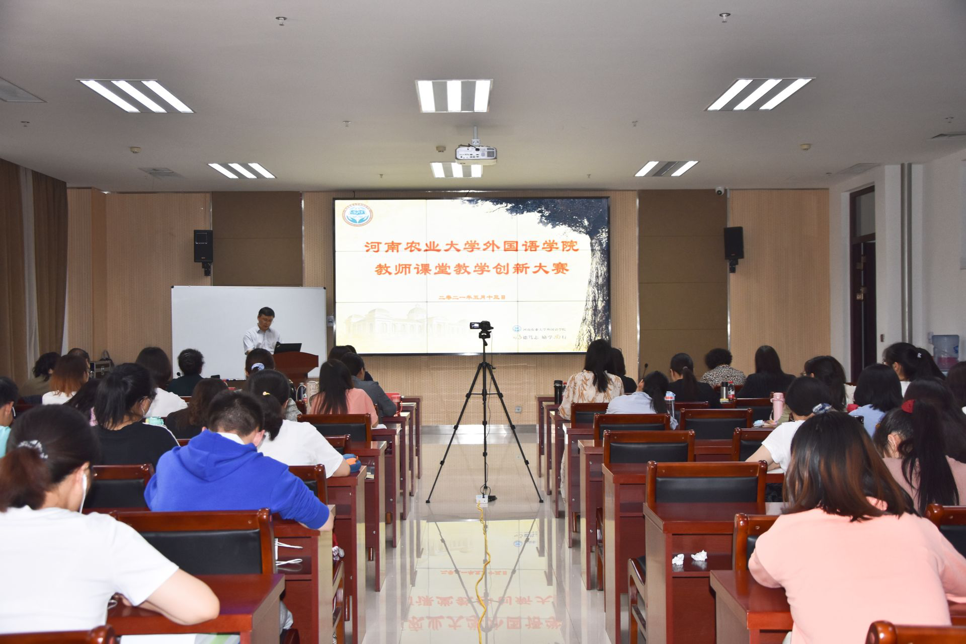 本网讯(审稿:黄彪 供稿:黄湘)为深化党史学习教育内涵,提高教师教学创新能力与教学水平,促进学院教学质量的提高,5月13日下午2:30,外国语学院于龙子湖校区繁塔楼A324会议室举办了2021年度教师课堂教学创新大赛。教务处副处长王金铎莅临指导,校教学督导郑笑平,院教学督导张冬梅、罗春凤、院党委书记邓振营以及各系部教授代表组成评委团,学院教工代表观摩比赛,大赛由院长张俊杰主持。