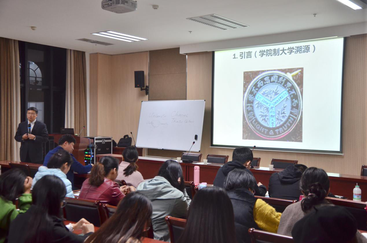 本网讯(审稿:李沛 供稿:梅如意)为探讨学院制大学人才培养模式,推动学院人才建设,提升人才培养水平,11月7日晚7点,我院诚邀学院英语语言文学博士、MTI教育中心主任张俊杰教授以“英国学院制大学人才培养模式管窥—以剑桥大学为例”为主题做学术讲座。院团委书记李沛、科研秘书马孝幸、英语系曲臻禛老师携我院全体研究生及部分本科生聆听了此次讲座。