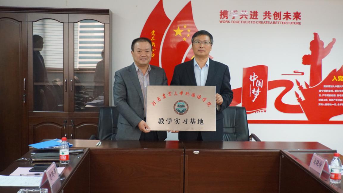 张亮哲和张俊杰分别代表双方签署了翻译实习实训基地合作协议,举行了就业实习基地挂牌仪式。双方表示希望以签约仪式为契机,在人才培养、语言服务、科研合作与交流等方面开展全面战略合作,共同致力于提升外国语学院为河南地方社会经济发展提供语言服务的能力和水平、促进河南博览事业发展和提高河南对外开放水平。