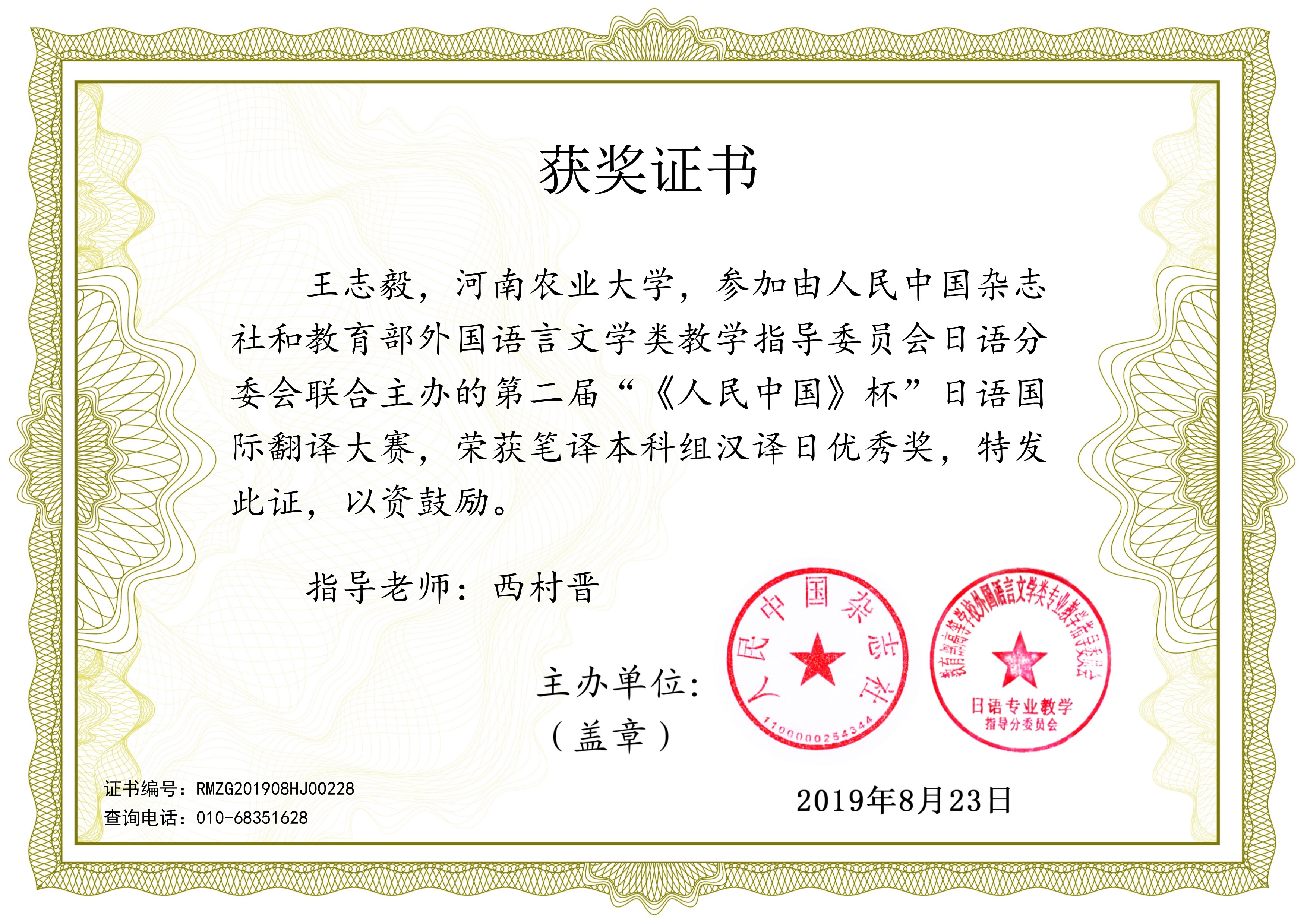 本网讯(审稿:李沛 供稿:张丹丹)第二届“人民中国杯”日语国际翻译大赛于2019年3月至7月期间举行。我院学子积极参与此次大赛。其中,王志毅在外教西村晋老师的指导下,深入巩固日语基础知识,扎实打牢日语翻译知识体系,广泛拓展积累课外知识,最终斩获笔译组汉译日全国优秀奖。