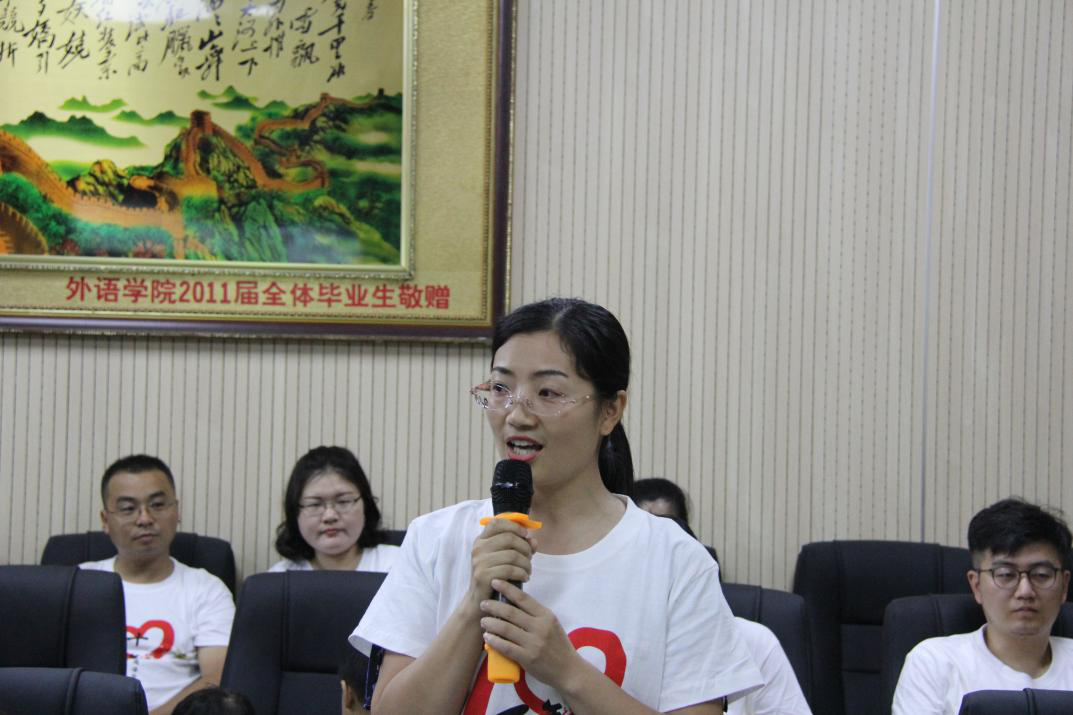 李喜芬代表学院致词,她向校友们的到来表示热烈的欢迎和诚挚的感谢,并向大家介绍了学院近年来的发展变化。她动情地说:“农大外语人们,无论走多远,这里永远是你们的家!”