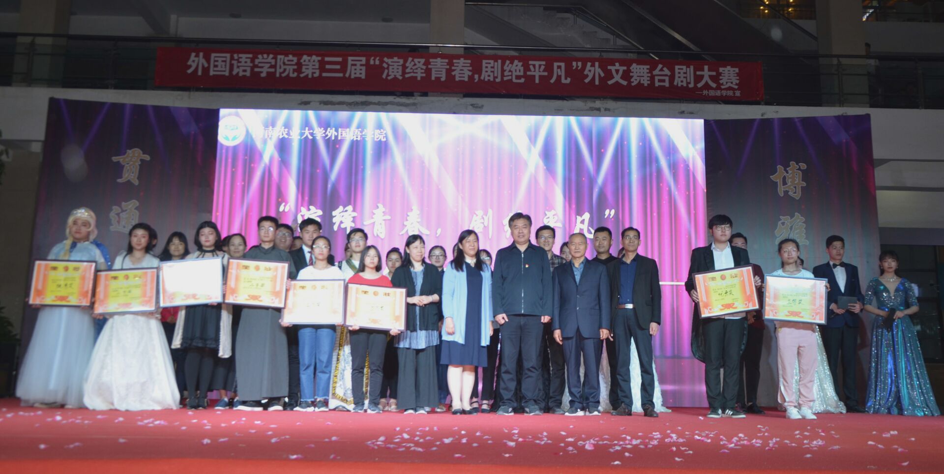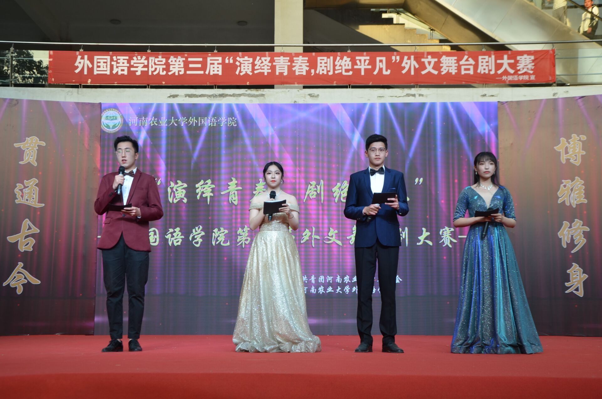 本网讯(审稿:王颖 供稿:陈晓寒)为庆祝新中国成立七十周年,弘爱国之心、立青春之志,提高口语表达能力,我院于2019年5月10日晚上六点半在龙子湖校区一餐厅广场举办外文舞台剧大赛决赛。校党委副书记、工会主席李成吾、院关工委常务副主任吴海峰、校团委书记马菲等出席比赛,张莉、杨华、刘靖宇、刘佳、聂宝玉担任评委。学院领导班子携师生代表观看了比赛。