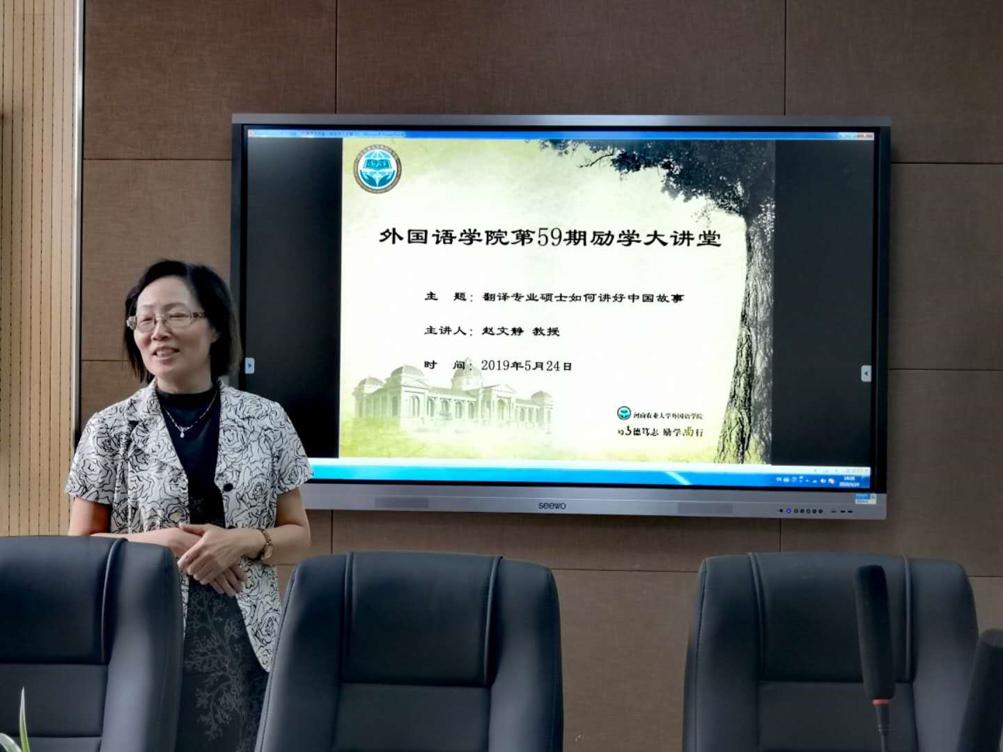 (供稿:刘淑苗)党的十九大报告提出,要“加强中外人文交流,以我为主、兼收并蓄。推进国际传播能力建设,讲好中国故事,展现真实、立体、全面的中国,提高国家文化软实力。”为响应这一重大的时代命题和使命,我院于2019年5月24日邀请河南师范大学教授、翻译学博士赵文静教授走进外国语学院第59期励学大讲堂,为我们做了以“翻译专业硕士如何讲好中国故事”为主题的讲座。