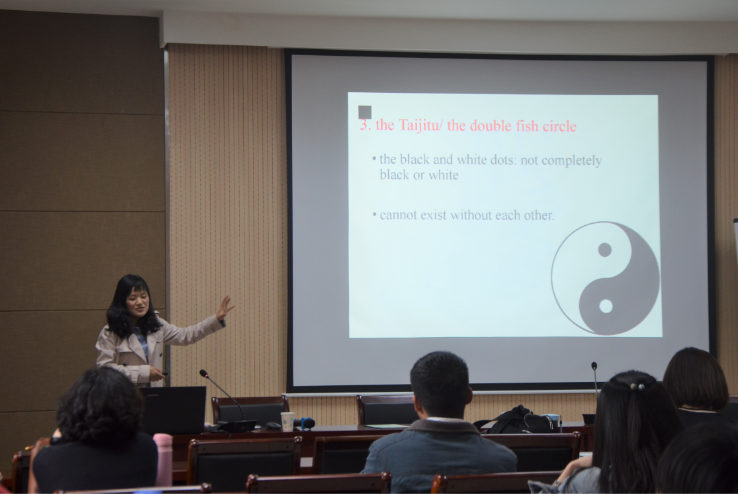 本次会议分为教学观摩和集中研讨两个环节。会议伊始,朱婧老师和聂宝玉老师分别以How to Use SWOT Analysis和Yin–Yang为题,结合专业特色和个人风格,借助图文并茂的精美课件,用生动形象的肢体语言以及流利的全英文讲授为大家展现了精彩有趣的课堂,赢得了在场观摩教师的阵阵掌声。