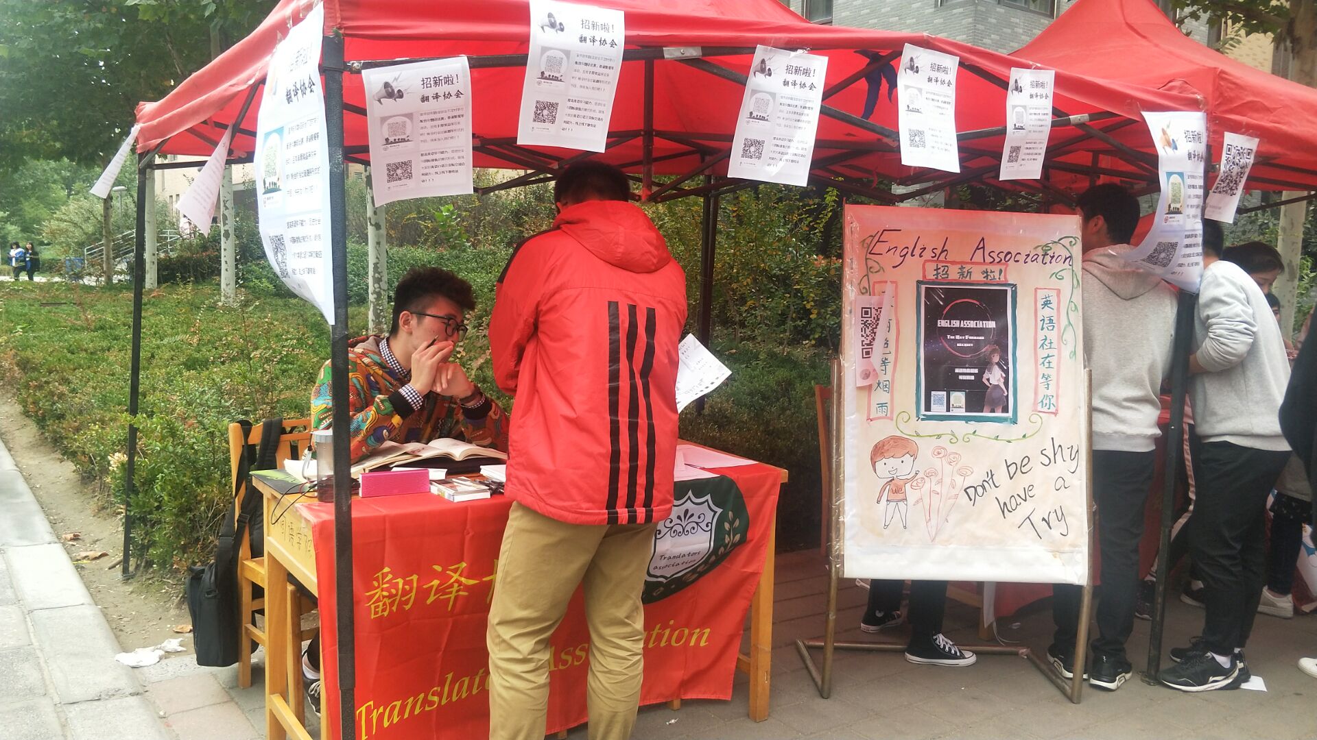 本网讯(审稿:王颖 供稿:陈晓寒)为丰富学生校园生活,提供锻炼自身能力的平台,10月20日至21日,“百团大战”社团招新活动在龙子湖校区一餐厅广场如火如荼地进行。其中,隶属于我院的横溢方舟、翻译协会、乐友吉他社等社团在此次社团招新中展现出别样的风采。