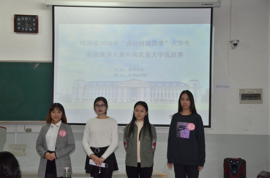 本网讯(审稿:王颖 供稿:饶芝玉)为鼓励学生用英语宣讲河南,传播新时代河南声音,展示新时代河南形象,10月23日下午两点,由校学工部主办、外国语学院承办的河南省2018年“讲好河南故事”大学生英语演讲大赛河南农业大学选拔赛在龙子湖校区繁塔楼C202教室隆重举行。教师刘佳、吴玲、杨澜、李筱洁、韩斐应邀担任评委。学院党委副书记周晓出席此次选拔赛。