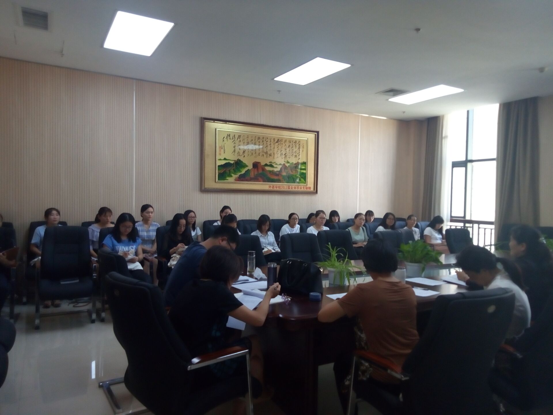 本网讯(审稿:王颖 供稿:陈晓寒)为迎接2018级研究生的到来,帮助新生尽快融入研究生生活,我院于9月11日下午2点在龙子湖校区繁塔楼A320教室举办2018级MTI新生入学教育暨导师见面会。院长李喜芬、院党委副书记周晓及各位导师携2018级MTI全体学生出席会议。