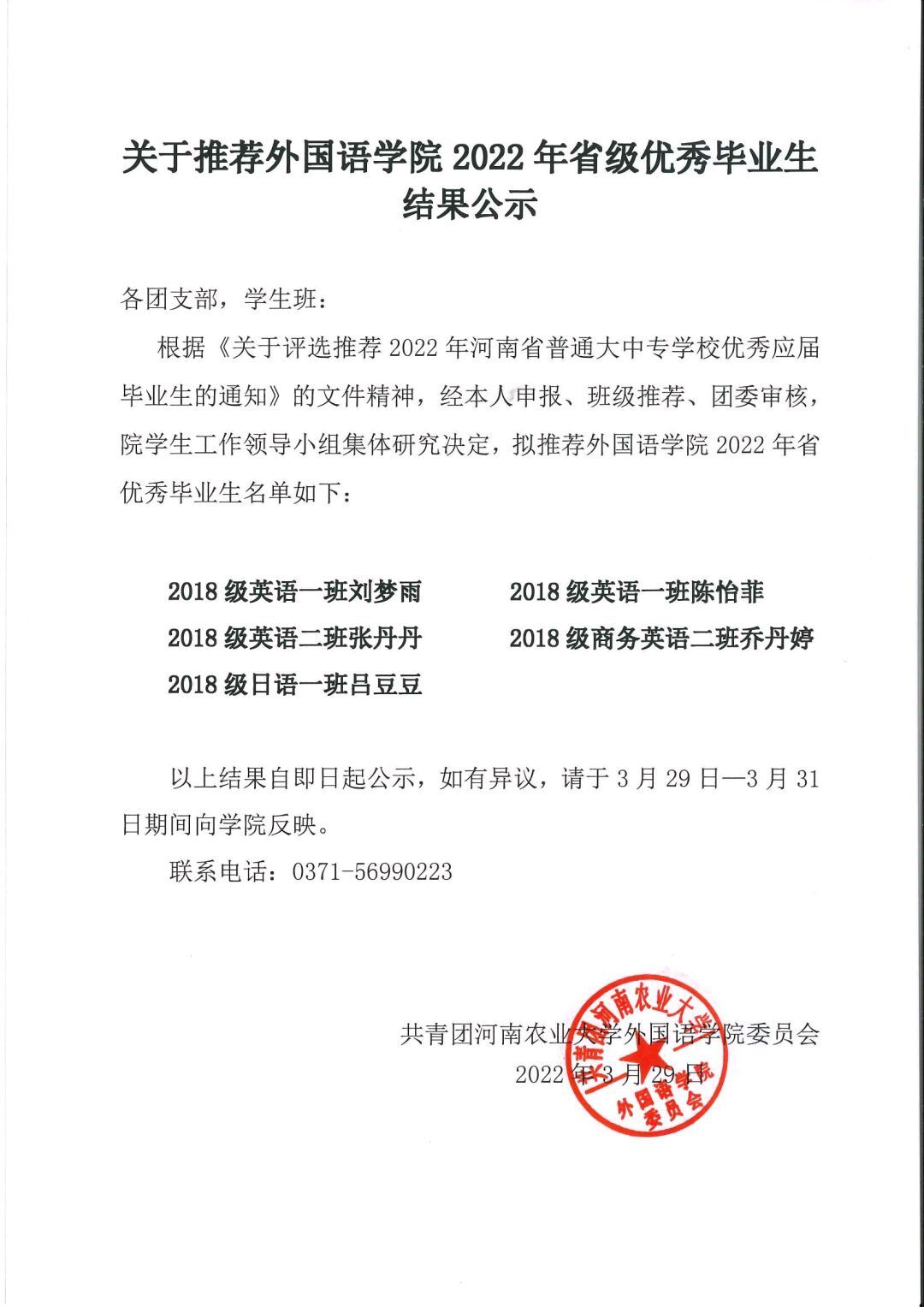 关于推荐外国语学院2022年省级优秀毕业生结果公示
