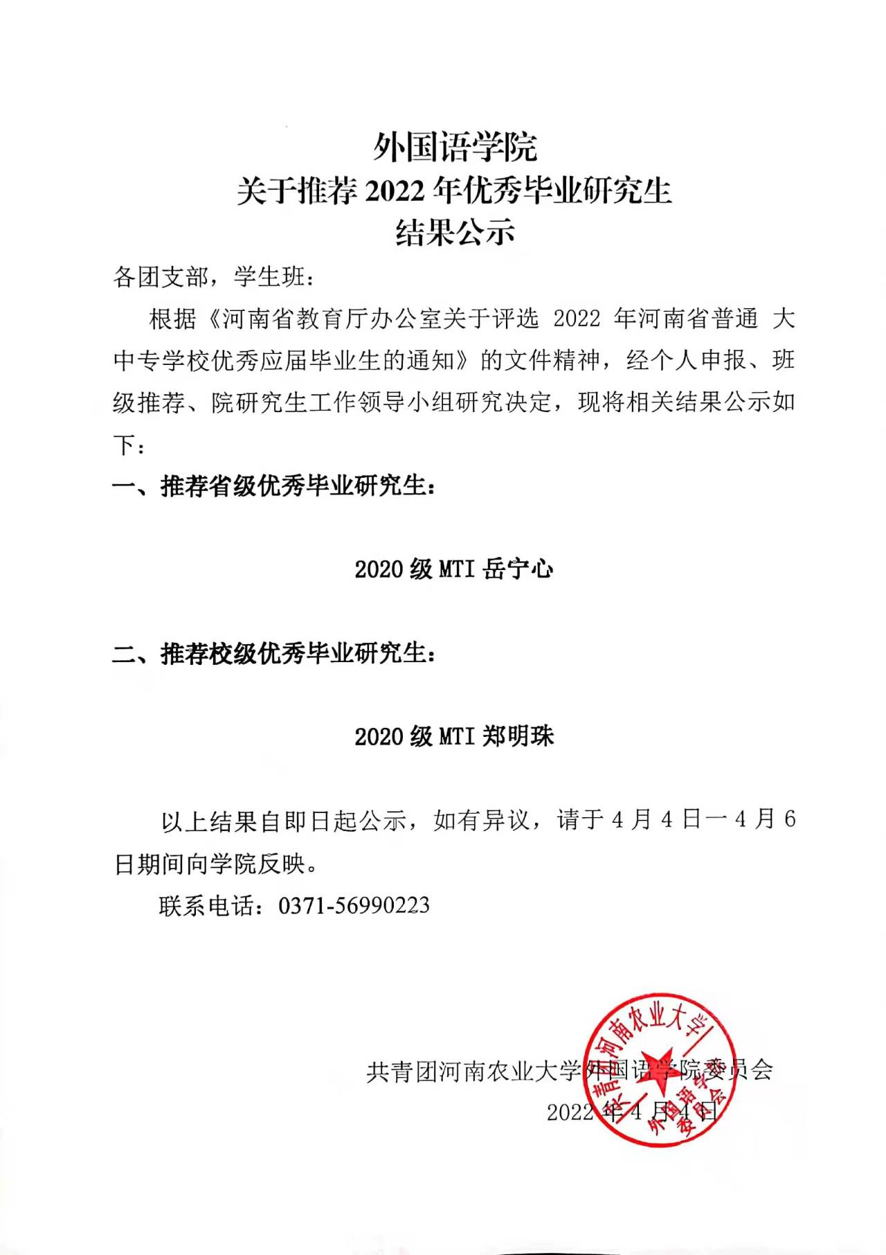 外国语学院关于推荐2022年优秀毕业研究生结果公示