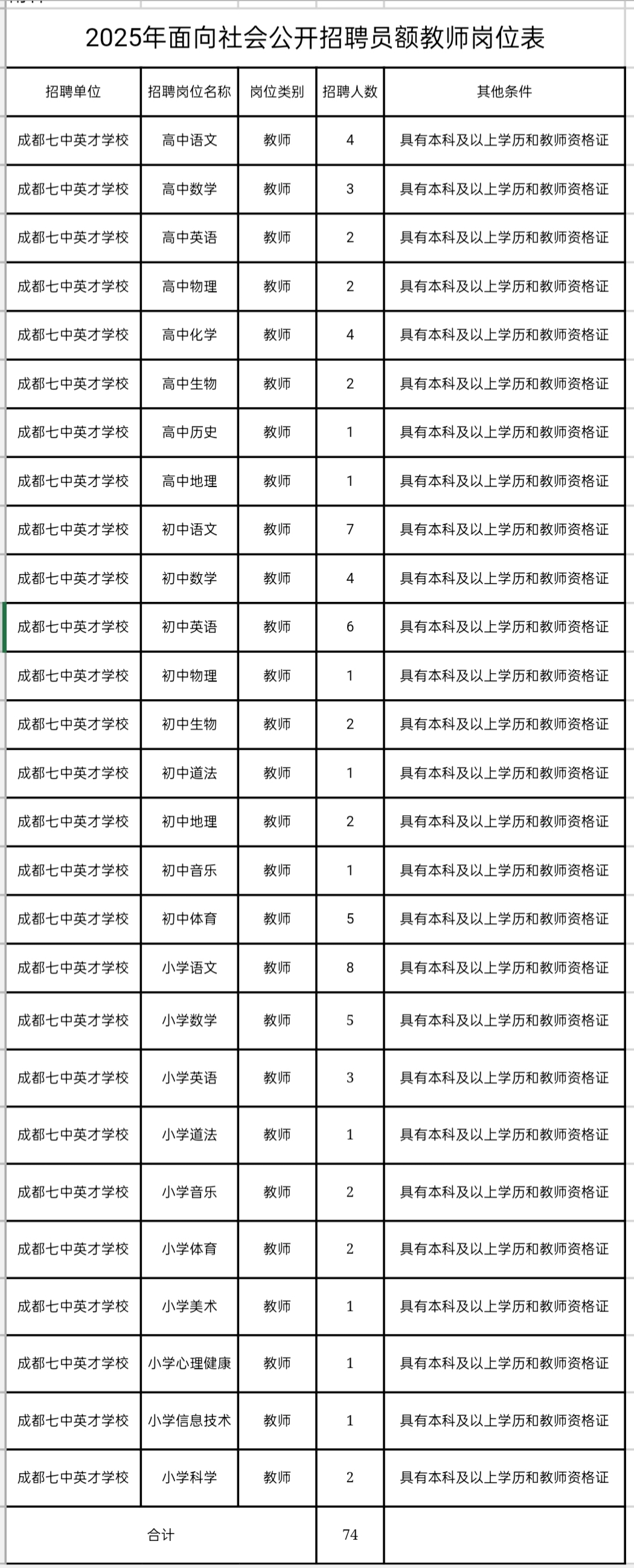 成都七中英才学校2025年招聘教师公告