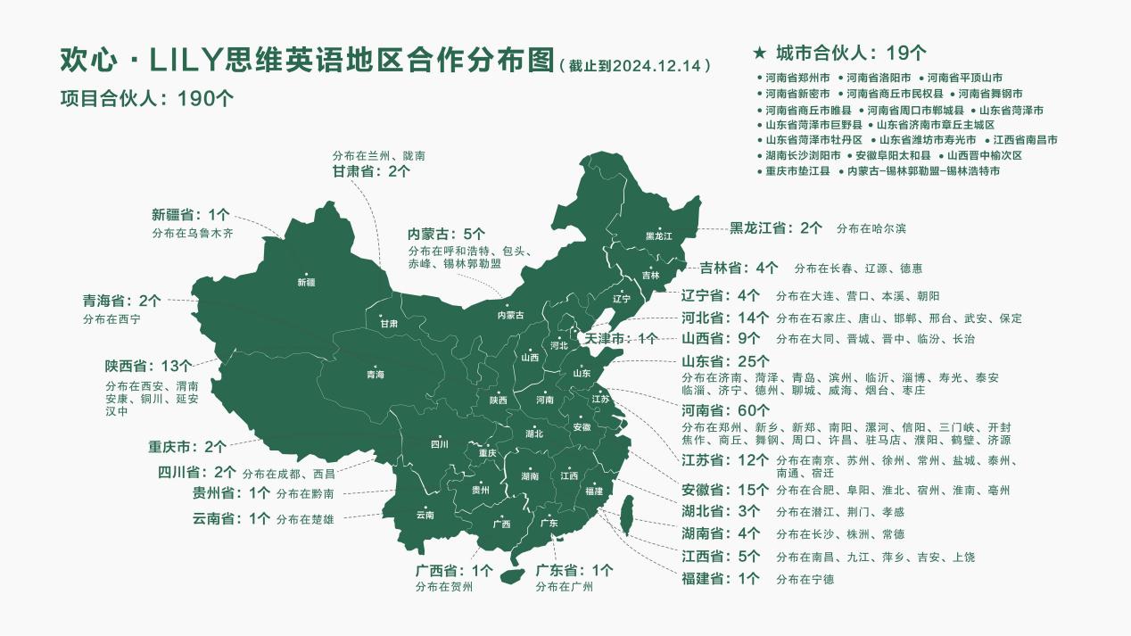欢心LILY思维英语产品经过多年的沉淀,得到了广大家长的认可,目前已在北京建立研发中心,在杭州建立流量中心,在郑州建立师训中心。已经拥有全国200多家线下合作机构,真正成为了少儿英语启蒙第一品牌,也成为了机构英语产品的首选。
