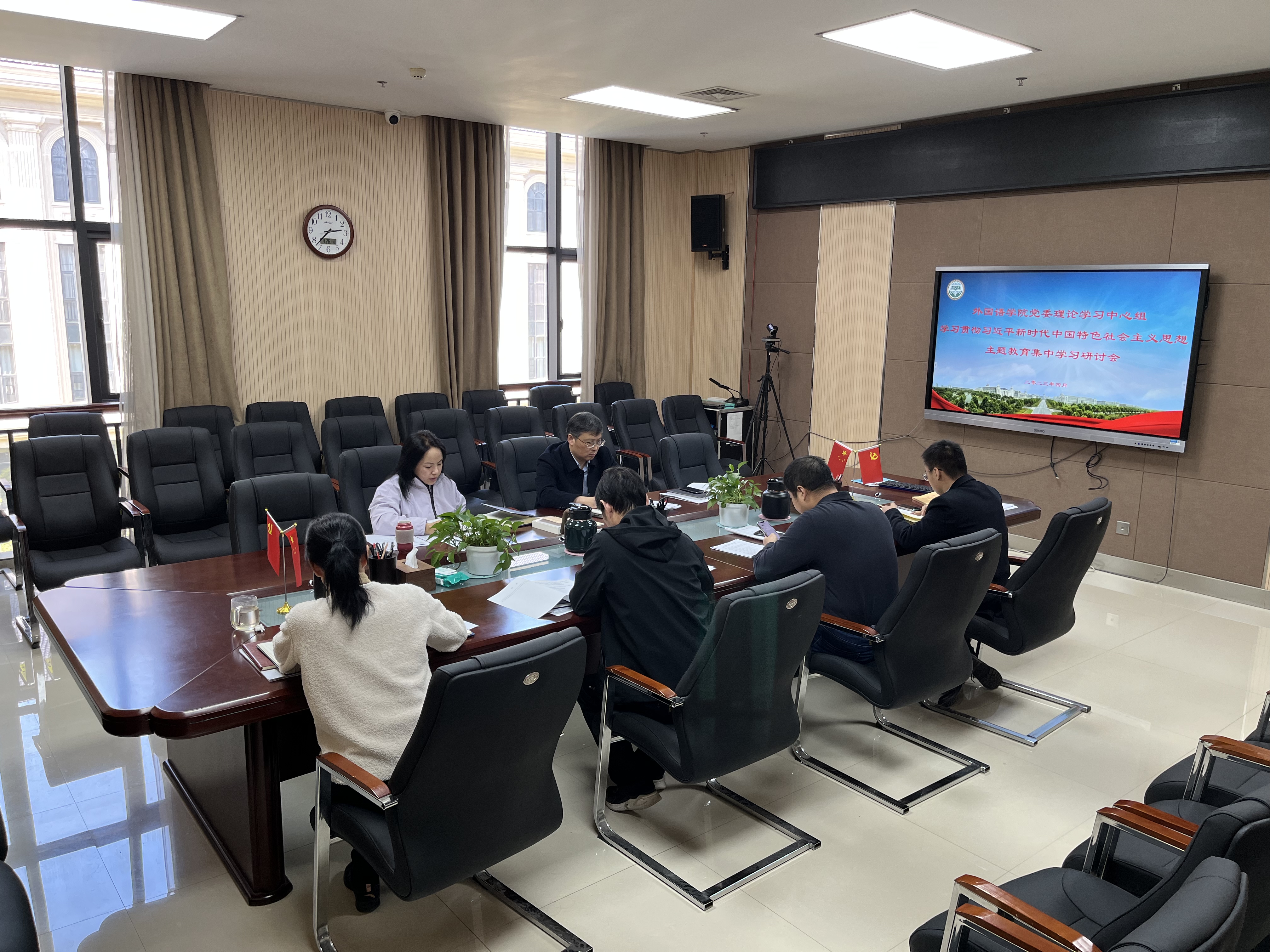 本网讯(审稿:王燕萍 供稿:郝晓峰 吕品)4月25日,外国语学院党委理论学习中心组举行学习贯彻习近平新时代中国特色社会主义思想主题教育第一次集中学习研讨。集中学习研讨会由我院党委书记王燕萍主持,学院全体党委委员参加。