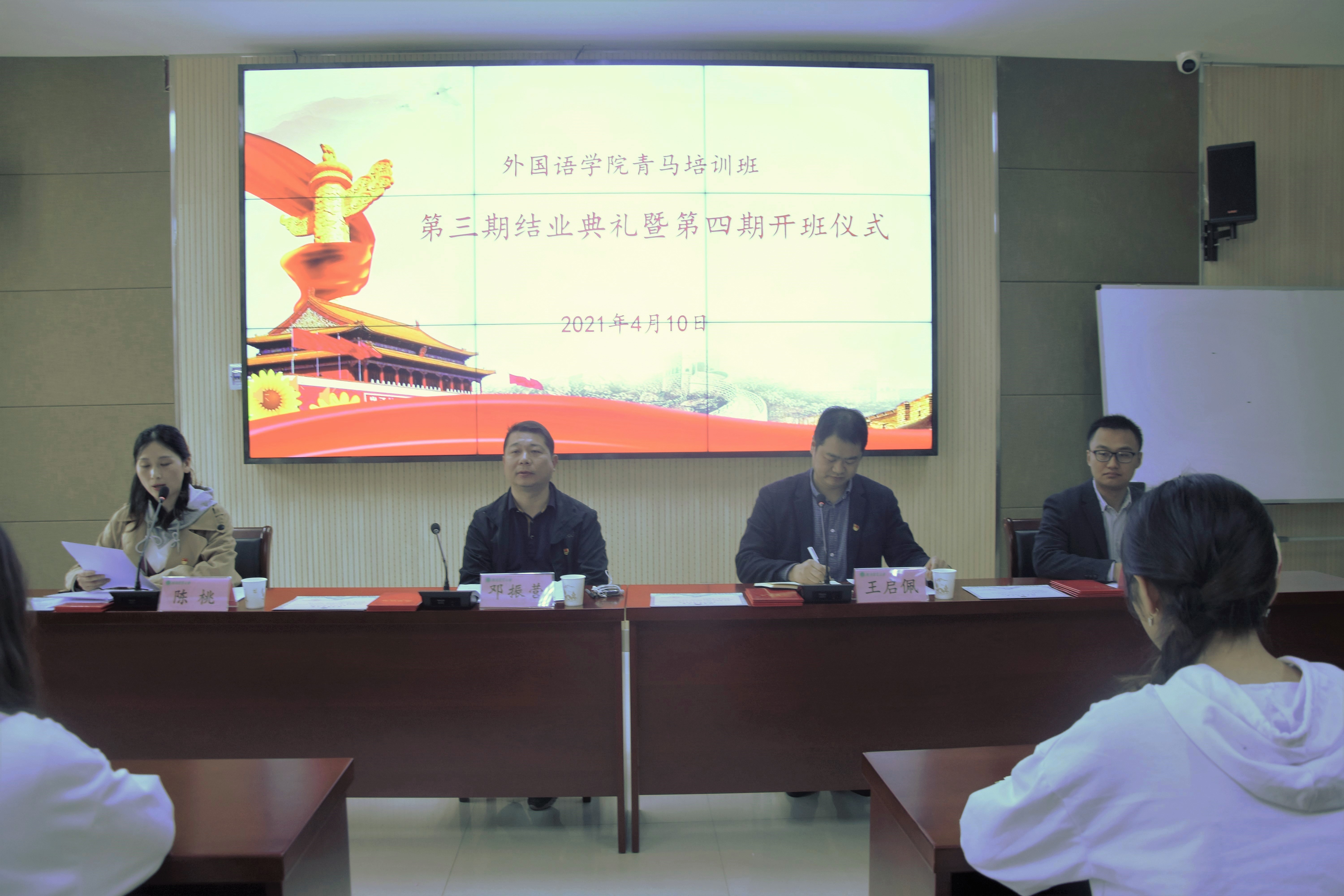 本网讯(审稿:陈桃 供稿:王莉)为培养中国特色社会主义建设者和接班人,坚定走中国特色社会主义道路的理想信念,我院于4月10日中午12点半在龙子湖校区繁塔楼会议室A324举行了青马培训班第三期结业典礼暨第四期开班仪式。院党委书记邓振营、院党委副书记王启佩、院团委副书记陈桃、院团委书记冯超出席仪式。