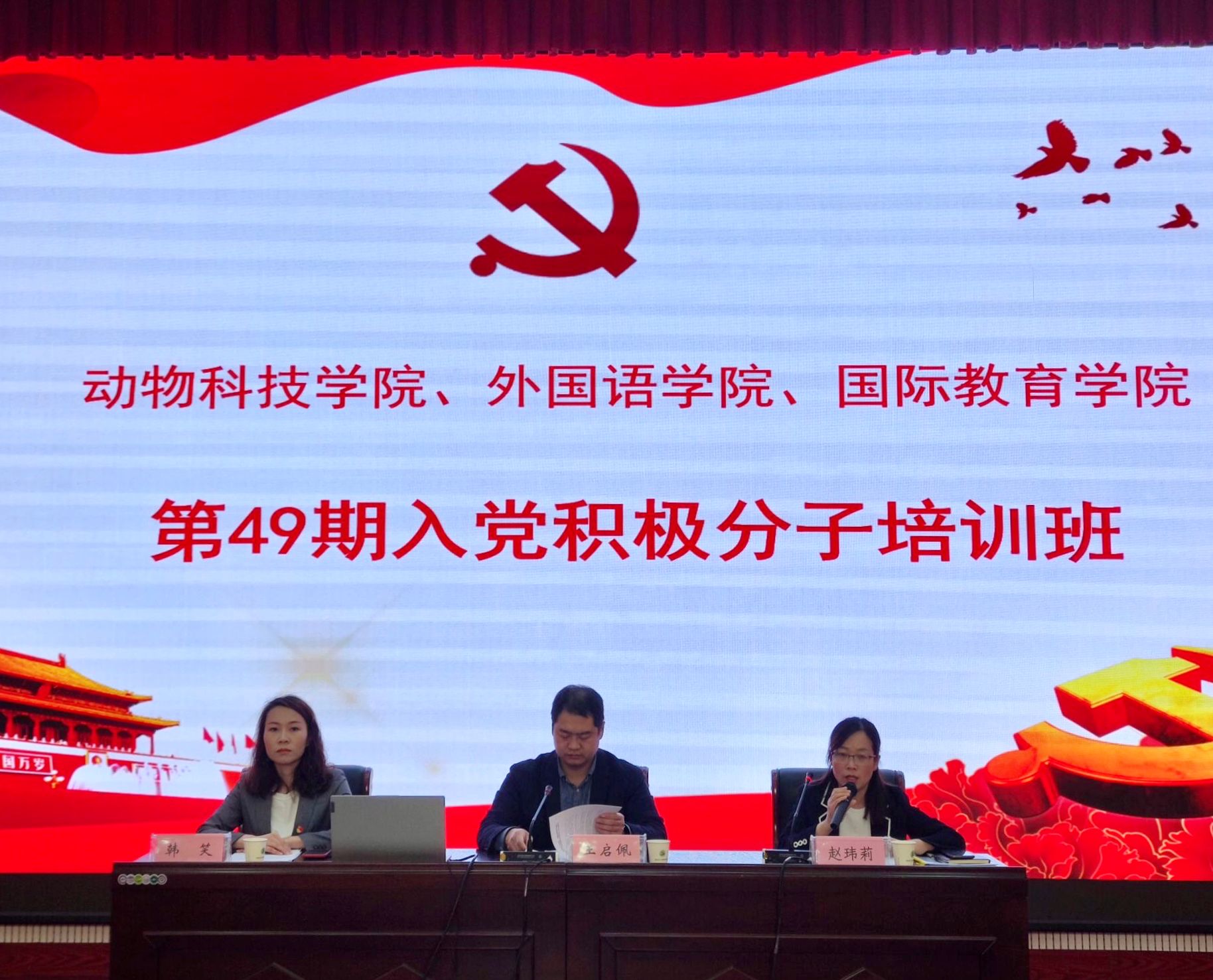 本网讯(审稿:陈桃 供稿:王莉)为加深我院入党积极分子对党的认识,坚定入党决心,提高党性修养。我院共137名入党积极分子参加了由外国语学院、动物科技学院及国际教育学院三院联合举办的第49期入党积极分子培训班。本次培训班开班仪式于4月11日上午八点半在龙子湖校区繁塔楼AB间大教室一举行,外国语学院党委副书记王启佩及团委副书记陈桃、动物科技学院党委副书记韩笑、国际教育学院党委副书记赵玮莉出席本次开班仪式。会议由动物科技学院团委书记韩笑主持。
