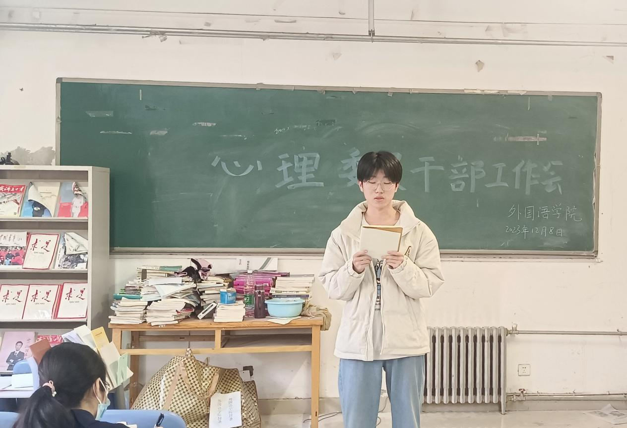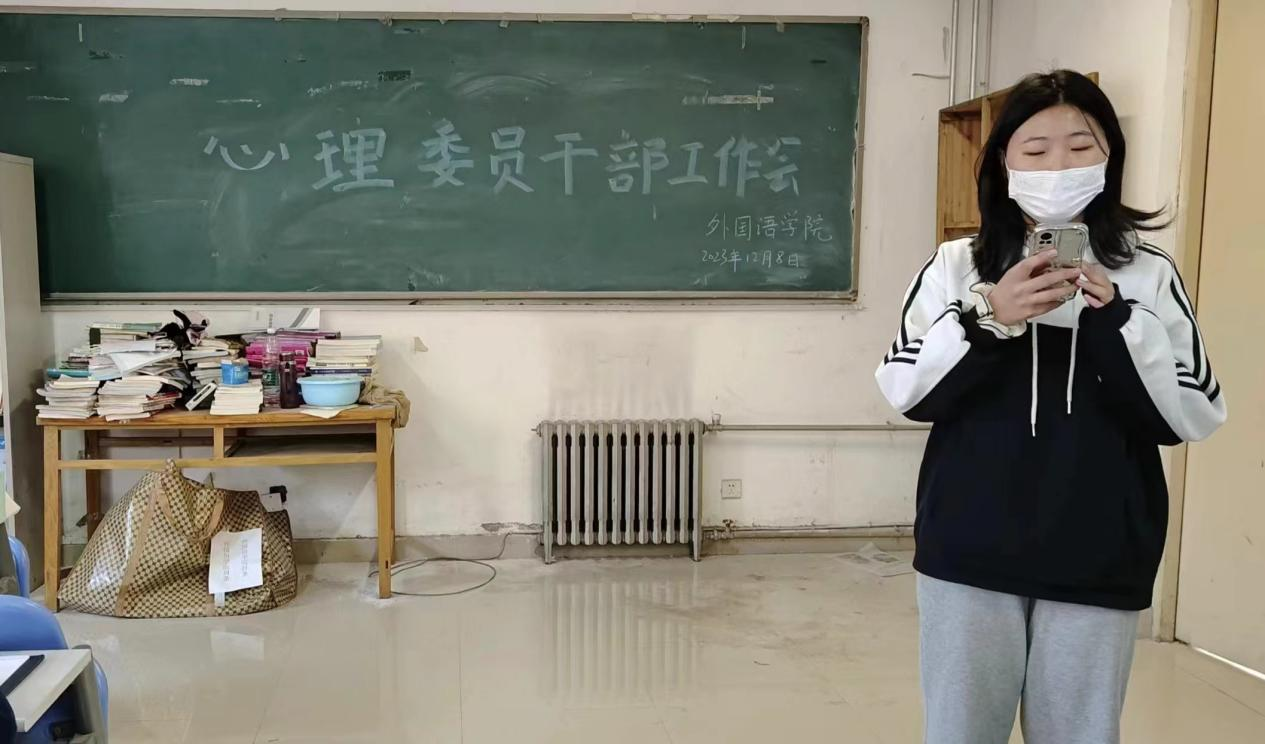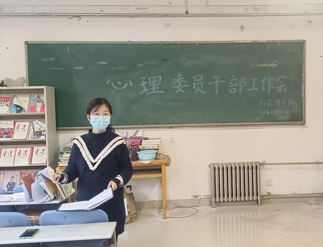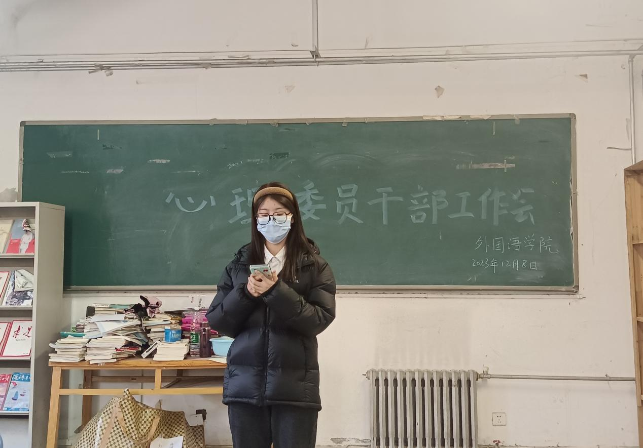 本网讯(审稿:王启佩 供稿:武宗励 赵雨焯)为准确了解学生近期心理健康状态,加强学院学生心理健康工作建设,12月8日中午,外国语学院在辅导员武宗励老师的带领下,于龙子湖校区举行本学期第六次心理委员干部工作会议。