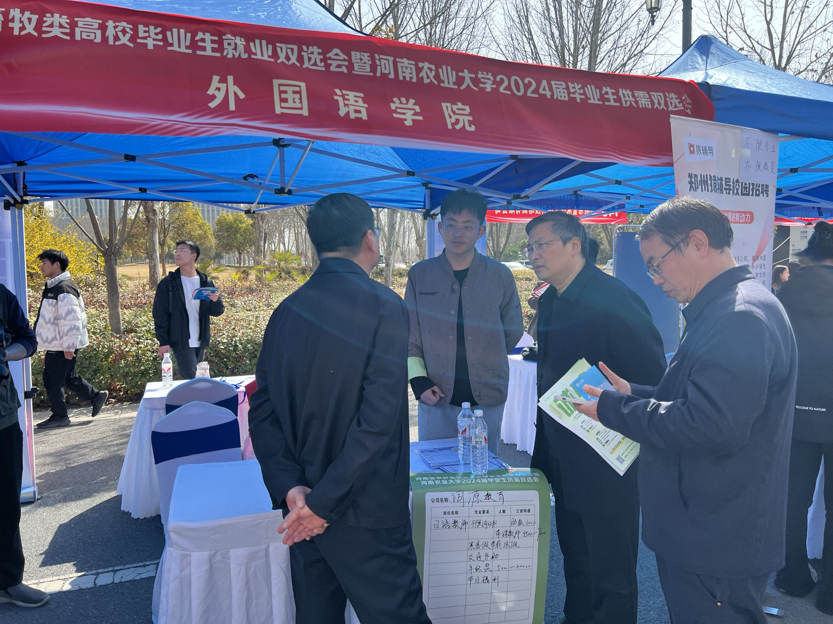 在龙子湖校区举办,外国语学院积极组织用人单位报名参加,院长张俊杰在到现场与用人单位沟通交流,2024届毕业生到积极参加此此双选会。