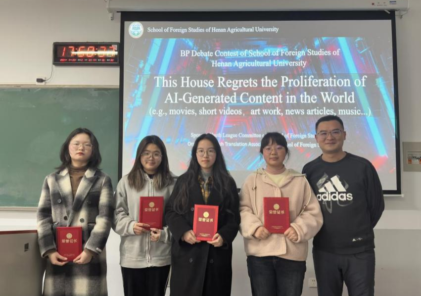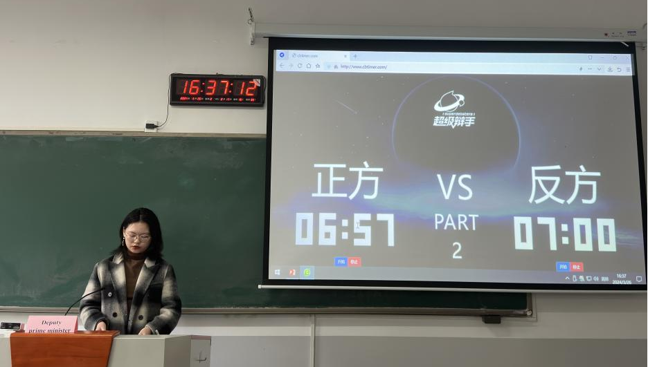 本次比赛采用了英国议会制辩论赛赛制,双方辩手围绕“This House Regrets the Proliferation of AI-Generated Content in the World”这一具有时代特色的话题展开辩论。各位辩手逻辑清晰、旁征博引,充分展现了我院青年学子的时代思考、思辨能力和语言能力。评委老师根据辩手表现进行了现场打分并给予了高度评价,鼓励他们在今后的学习和生活中继续发挥自己的优势,不断提高自己的英语水平。