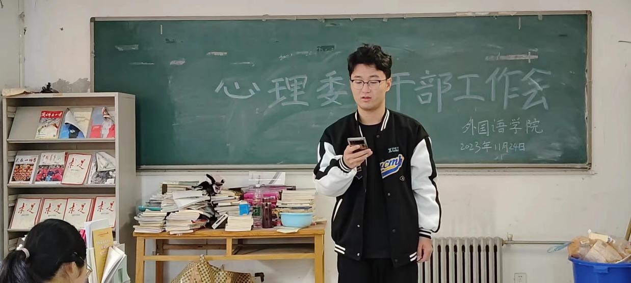 本网讯(审稿:王启佩 供稿:武宗励)11月24日中午,外国语学院在辅导员武宗励老师的带领下,于龙子湖校区成功举行了本学期第五次心理委员干部工作会议。此次会议旨在准确掌握学生近期心理健康状态,加强学生心理健康教育,加强学院心理健康工作建设。