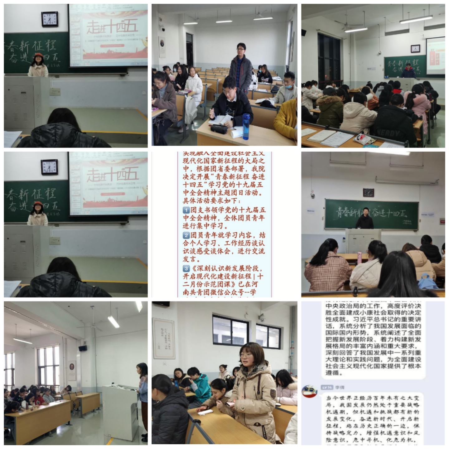 活动伊始,各支部积极组织支部成员观看河南省共青团“深刻认识新发展阶段 开启现代化建设新征程”示范团课,深入了解十九届五中全会的会议内容、重大意义,以及我国在新发展阶段的重要特征、有利条件、战略机遇等。从一年看五年,党和国家取得的历史性成就极为不易、经验极为宝贵;从五年看十五年,全面建设社会主义现代化国家的战略目标鼓舞人心、战略部署催人奋进;为了巩固学习成果,各团支部在团支书的组织和带领下展开了热烈讨论。讨论过程中,同学们畅所欲言、从不同角度发表见解。并纷纷表示要立志向、修品行、练本领,为成长为社会主义现代化国家的建设者时刻准备着;活动结束后,各支部成员纷纷撰写学习感悟,一篇篇内容详实、语言恳切的文章深刻有力地体现出我院学子敢于吃苦、敢于担当,愿将个人进步融入国家发展的雄心壮志。