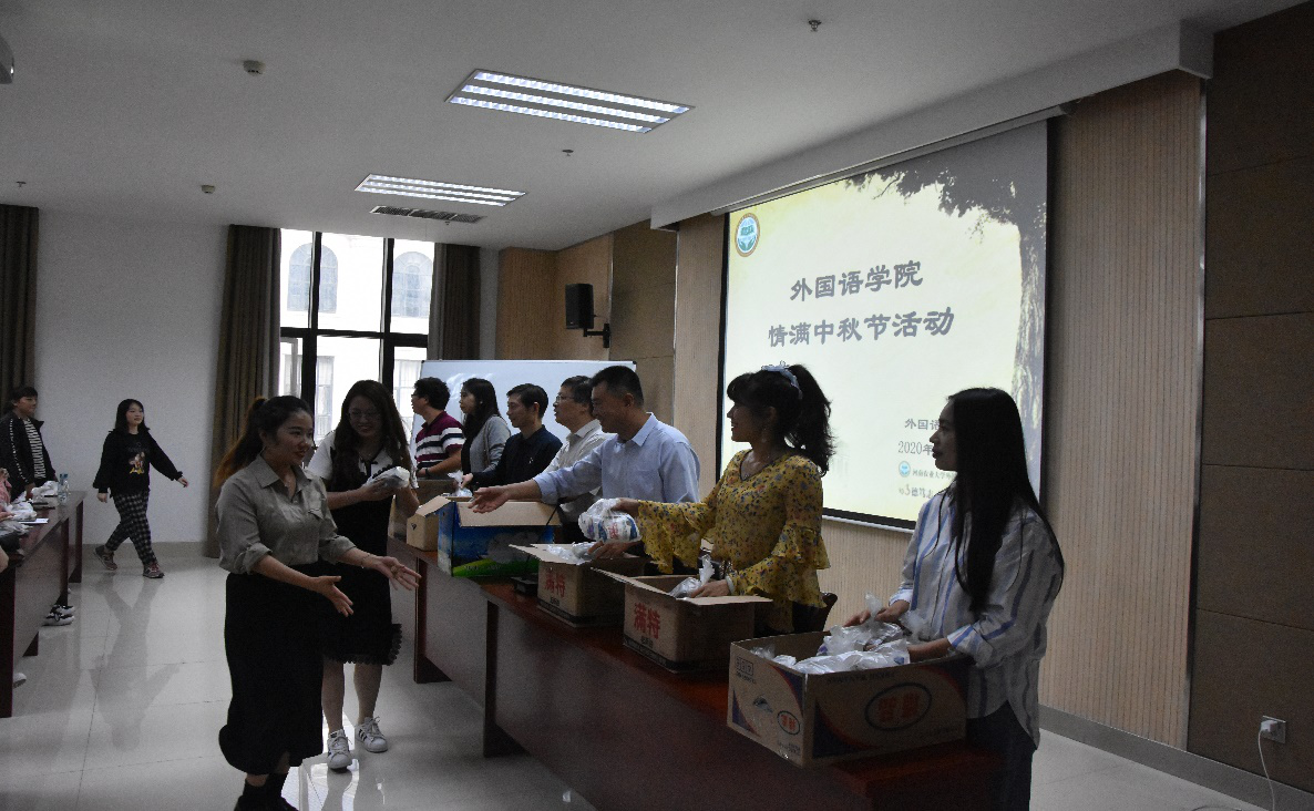 本网讯(通讯员:荣祝祥)为进一步贯彻落实学校疫情期间“非必需不外出”的要求,在中秋、国庆双节来临前夕,河南农业大学外国语学院在龙子湖校区A324开展了情满中秋节的活动。院长张俊杰携外国语学院领导班子和教师代表为同学们送上了月饼和酸奶。营造了浓烈的节日氛围,更送去了学院和老师们的温暖与关怀。