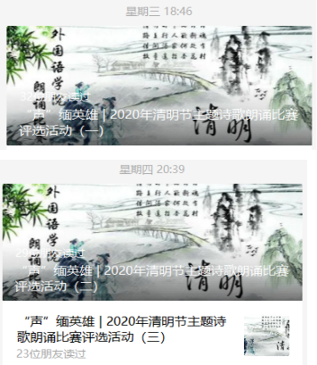 据悉,学院团委以“把灾难当教材,与祖国共成长”为主题开展清明节诗歌朗诵活动、配音大赛等第二课堂活动,“声”缅英雄、“声”援抗疫,向英雄致敬。