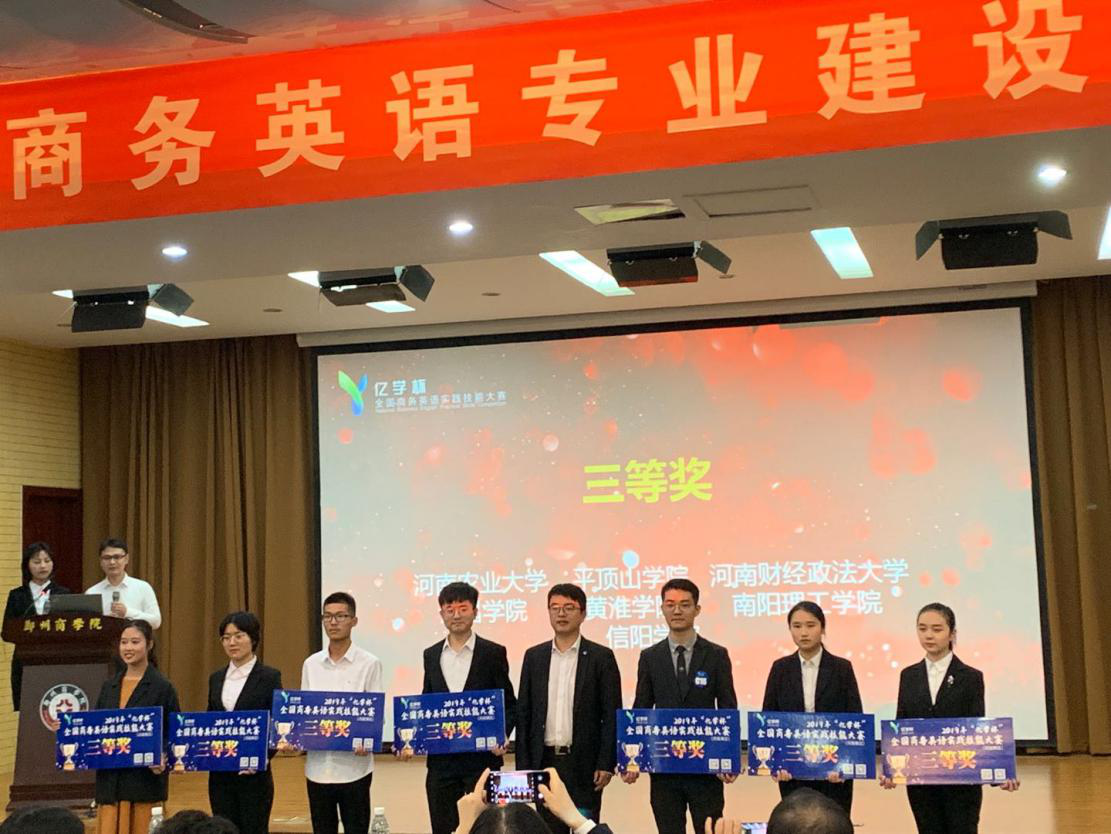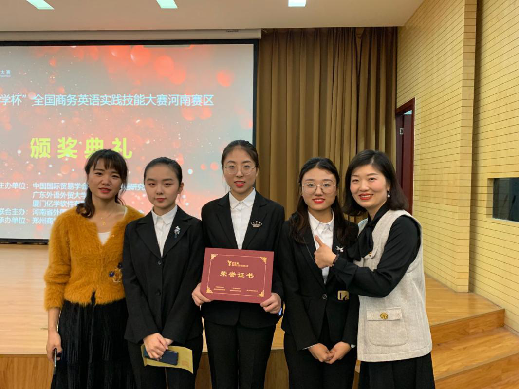 据悉,此次赛事由河南省外国语言文学教学指导委员会主办,郑州商学院外国语学院承办,分为现场演讲与上机作答两个部分,要求3名学生组成1个参赛团队,运用英语和商务知识解决国际贸易实务中遇到的询盘还盘、商务谈判、产品推荐等方面的问题。此次赛事受到了我院领导的高度重视。为此,我院积极创造条件,引导、鼓励学生参加竞赛。同时,悉心安排专业课老师,组织相关专业知识讲解会以及赛前培训。在两位老师的指导下,三位同学深入巩固商务英语基础知识,扎实打牢商务翻译知识体系,广泛拓展积累课外知识,为此次精彩的表现打下了坚实基础。