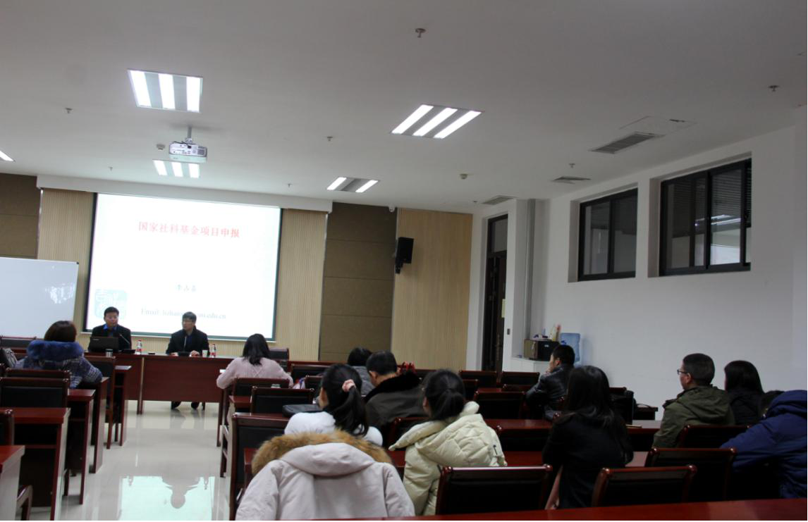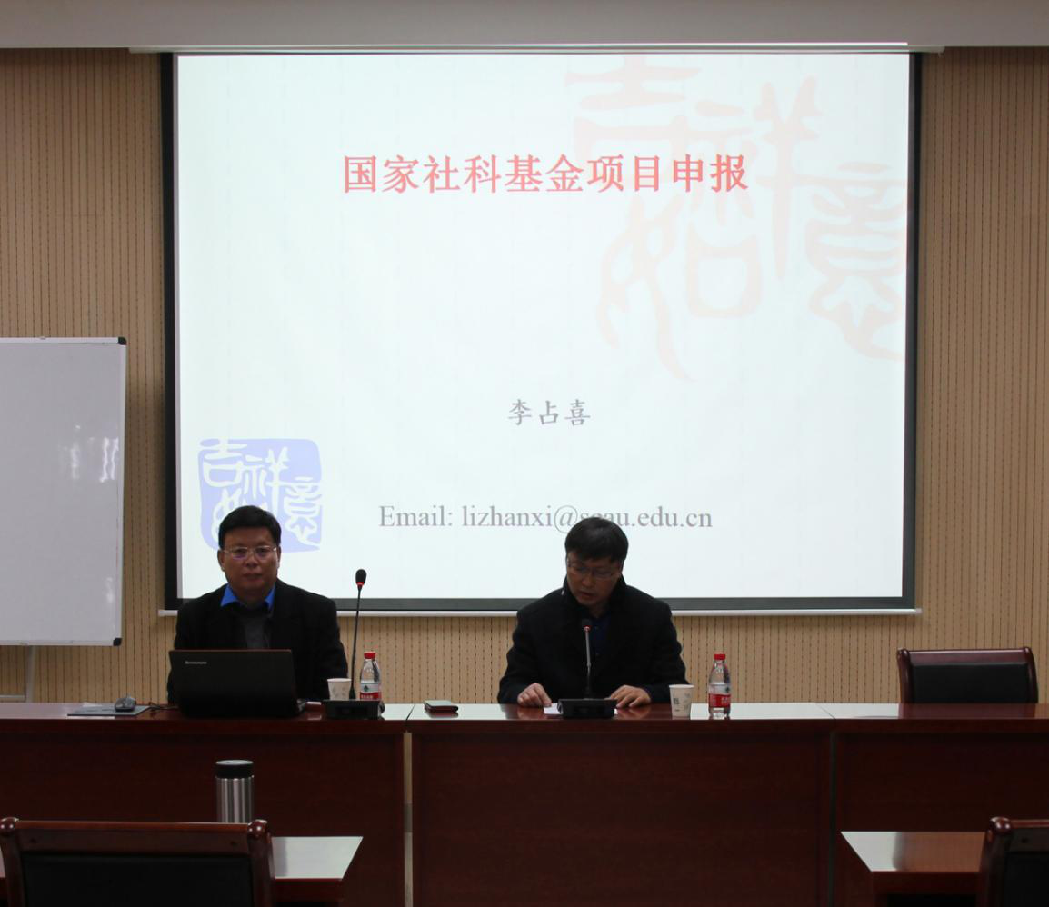 12月25日上午,华南农业大学外国语学院副院长李占喜教授应邀来我院作国家社科基金项目申报专题讲座,讲座由张俊杰副院长主持,我院全体博士、副教授及校级重点学科梯队成员和专任教师等到场聆听讲座。