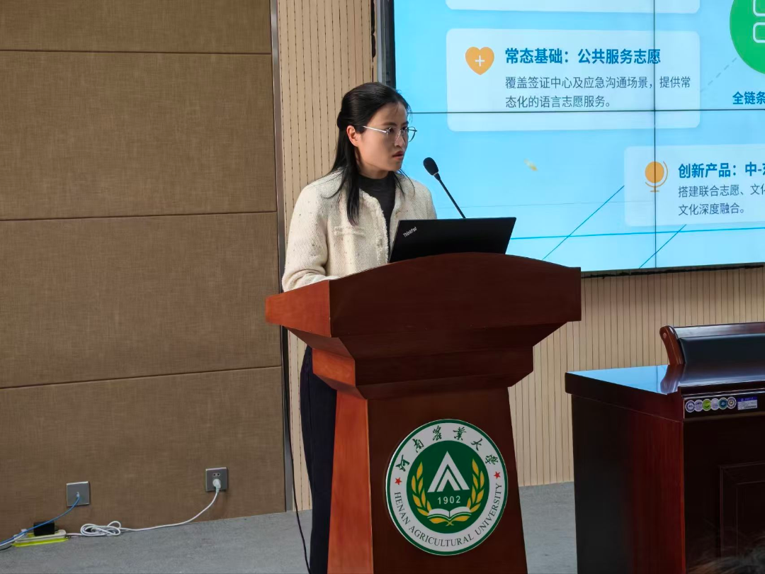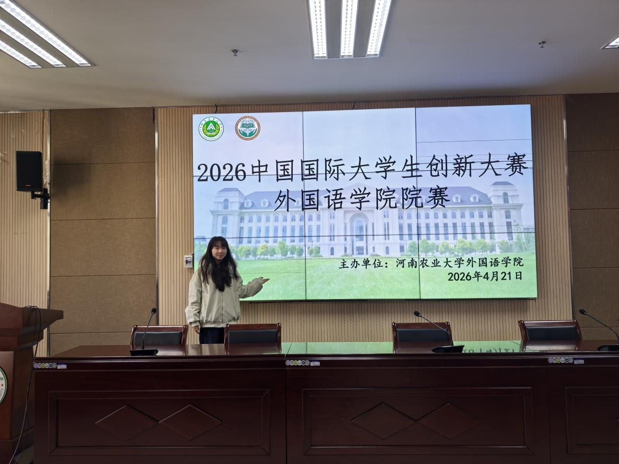 本网讯(审稿:张玥 供稿:武宗励 )为充分发挥外语专业优势,引导学子将语言特长与创新创业实践深度融合,培育兼具外语素养与创业能力的复合型人才,河南农业大学外国语学院于2026年4月21日,在龙子湖校区繁塔楼A324隆重举办2026年中国国际大学生创新大赛院级选拔赛。院团委书记李晶、团委副书记武宗励、副科级组织员侯彦冰受邀担任本次比赛评委,学院各级学生通过线上线下相结合的方式积极参与,共赴这场创新创业的青春盛宴。